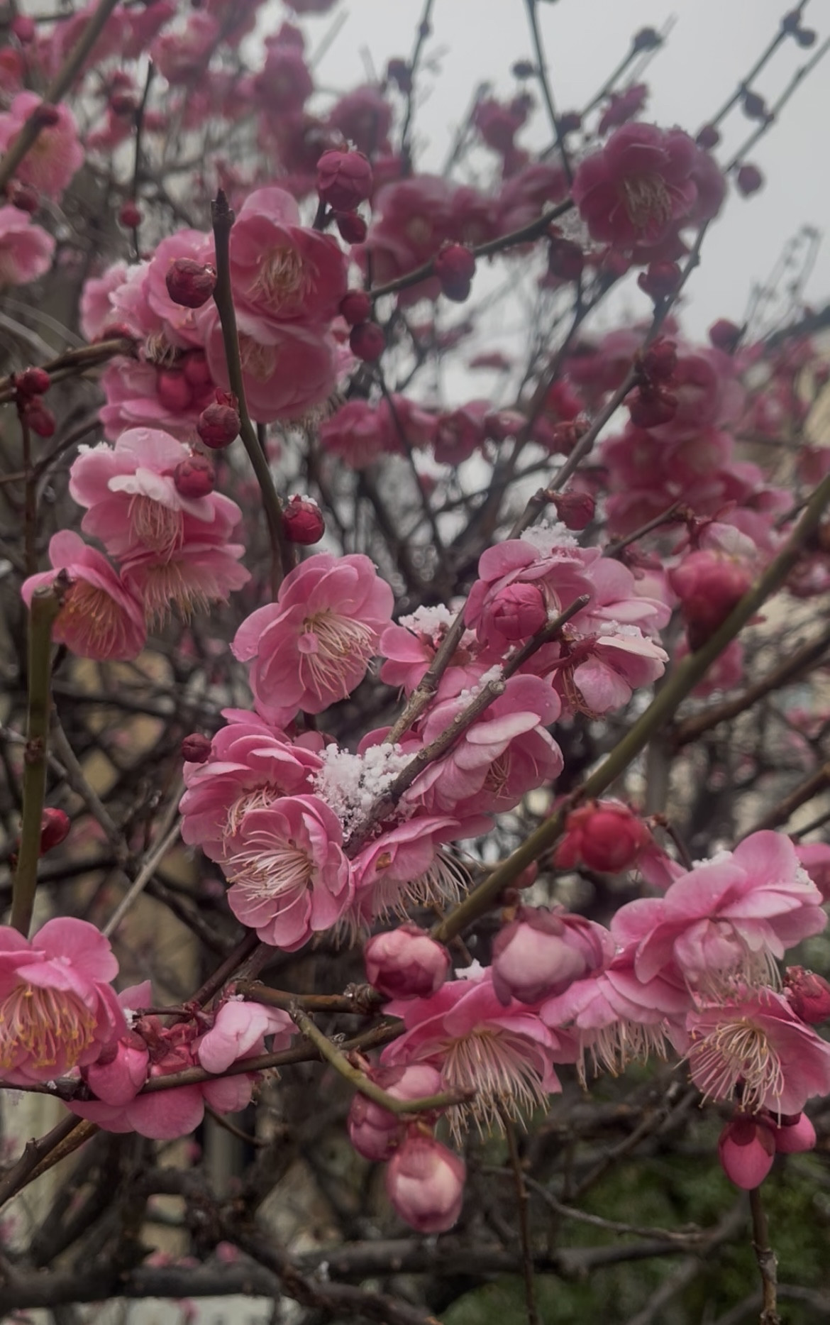 我が家の庭では、梅の花にほんの少しだけ雪が積もり、その様子を写真に収めてみました。